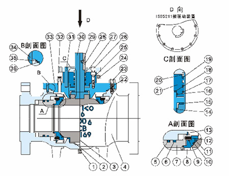 1、整體式閥體設計,上裝式耳軸固定支持,法蘭或對接焊結構;